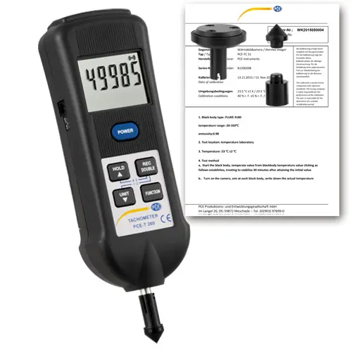 Tachometer & Stroboscope PCE-T 260-ICA: Alat ukur 2-in-1 presisi untuk kecepatan putar (0.5-99,990 rpm) dan temperatur dengan sensor IR, PT1000, atau Tipe K. Dilengkapi sertifikat kalibrasi ISO untuk hasil terjamin, cocok untuk industri, laboratorium, dan riset. Solusi lengkap dari PCE Instruments untuk analisa dan pemeliharaan mesin.