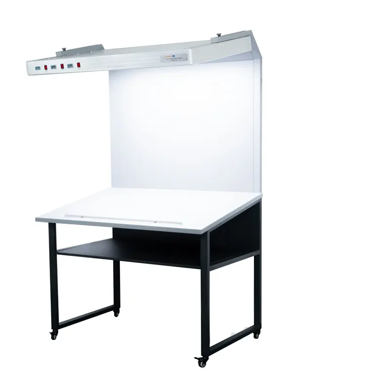 - Desain kabinet dengan platform kerja yang sangat luas (1350 x 900 mm) dan pencahayaan yang dioptimalkan. Posisi lampu strategis memberikan iluminasi seragam baik pada permukaan horizontal (meja) maupun vertikal (dinding belakang), sehingga cocok untuk memeriksa sampel berukuran besar atau dalam format yang berbeda dengan akurasi dan ketepatan tinggi.