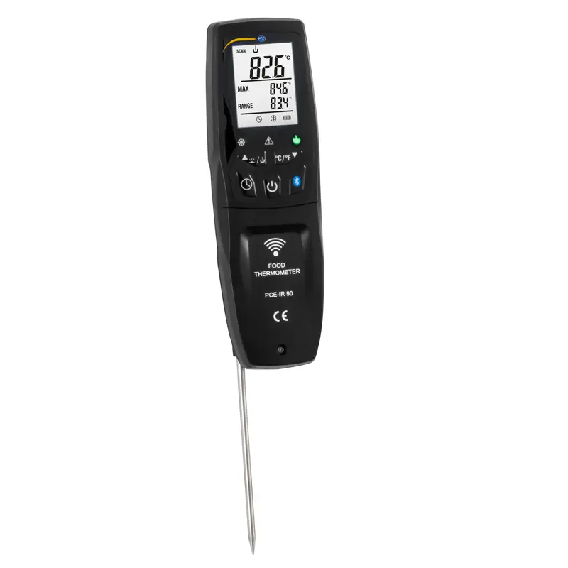 PCE-IR 90: Termometer makanan dual sensor (kontak & non-kontak) dengan Bluetooth untuk monitoring kondisi rantai dingin. Ukur suhu permukaan (-40…300°C) dan inti dengan akurasi tinggi, penuhi standar HACCP, dan catat data via app. Solusi lengkap untuk keamanan pangan.