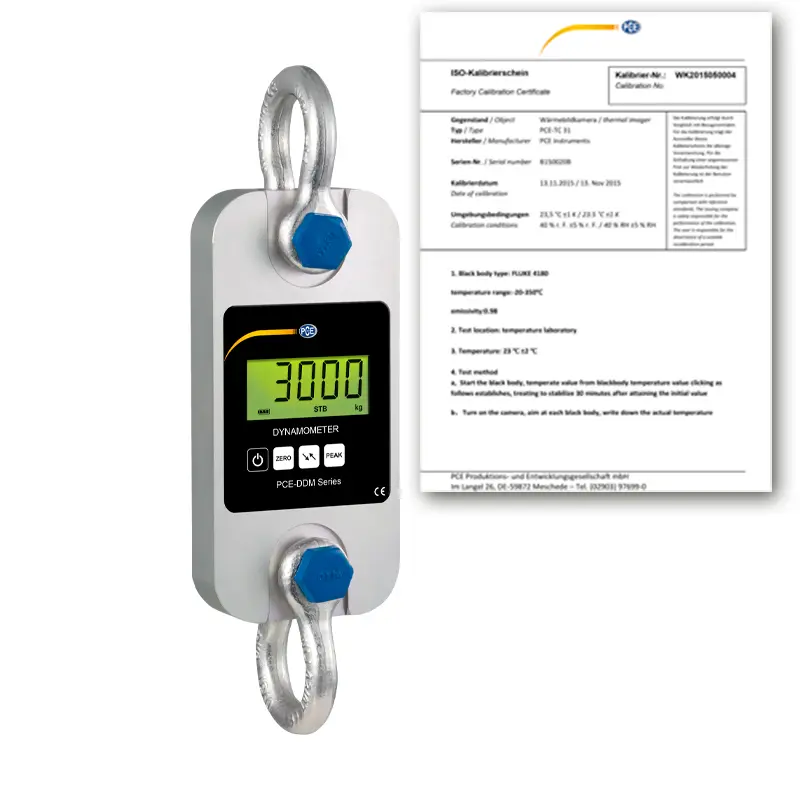 PCE-DDM 3WI-ICA Crane Scale / Timbangan Derek 3 Ton dengan Sertifikat Kalibrasi ISO. Solusi akurat untuk penimbangan beban besar & pengukuran gaya tarik hingga 3 ton. Portabel, lengkap dengan fitur peak hold, summation, dan sertifikasi kalibrasi untuk jaminan ketepatan pengukuran di industri.
