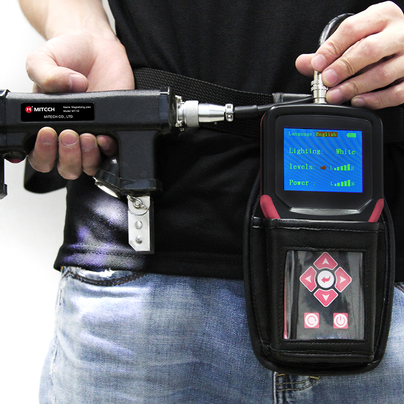 Prinsip kerja Mitech MT-1B berdasarkan metode Magnetic Particle Inspection (MPI). Alat ini pertama-tama memagnetisasi komponen uji (workpiece) dengan menciptakan medan magnet tinggi menggunakan electromagnetic yoke. Jika terdapat diskontinuitas seperti retak di permukaan atau dekat permukaan, medan magnet akan “bocor” (leakage flux) di area cacat tersebut. Serbuk magnet (magnetic powder) berkualitas tinggi-baik teknik basah maupun kering-kemudian diaplikasikan. Serbuk ini akan terkumpul dan membentuk indikasi yang jelas di sekitar kebocoran medan magnet. Di bawah pencahayaan yang tepat, indikasi ini menjadi terlihat, memungkinkan teknisi untuk mengidentifikasi posisi, ukuran, bentuk, dan tingkat keparahan cacat. Dibandingkan metode manual lama yang membutuhkan peralatan besar dan sumber listrik tetap, MT-1B mengintegrasikan teknologi variable-frequency dan baterai lithium untuk menghasilkan medan magnet yang konsisten dan portabel, meningkatkan akurasi deteksi cacat dalam dan permukaan secara signifikan.